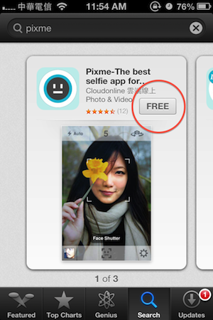1. 在iPhone的app store找到Pixme自拍王這套軟體然後下載,或點這裡下載,從9/16到9/22都是Free的喔!