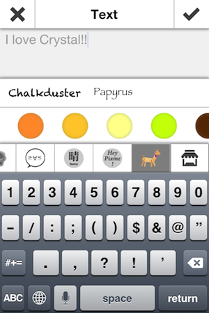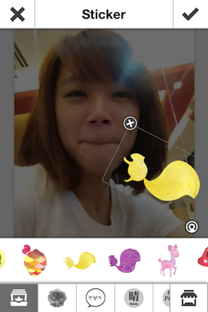 3. 貼紙介面,Pixme採用的是最新的「一指編輯」系統,只要用一支手指頭就能編輯囉,點右下角的按鈕就可以控制放大縮小跟旋轉